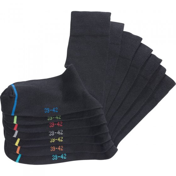 Deze KATOEN SOKKEN IN WEEKPAK (set van 7) hebben discrete, verschillende gekleurde markeringen op de voorvoet: Zo vindt u paren na wassen weer moeiteloos bij elkaar! Het materiaal met een hoog aandeel katoen zorgt voor een gezonde voet klimaat, de gladde, elastische gebreide omhult de voet, en zal niet kreuken. Blijvend elastisch ribboorden zorgen voor een goede ondersteuning. Zorgvuldige verwerking met een hoog comfort ribboorden. Zeer duurzame kwaliteit van 75% katoen, 20% polyester, 5% elastaan, wasbaar in de machine. Onze super praktische wekelijkse set biedt u zeven dagen top comfort - en perfecte orde in uw sok lade!