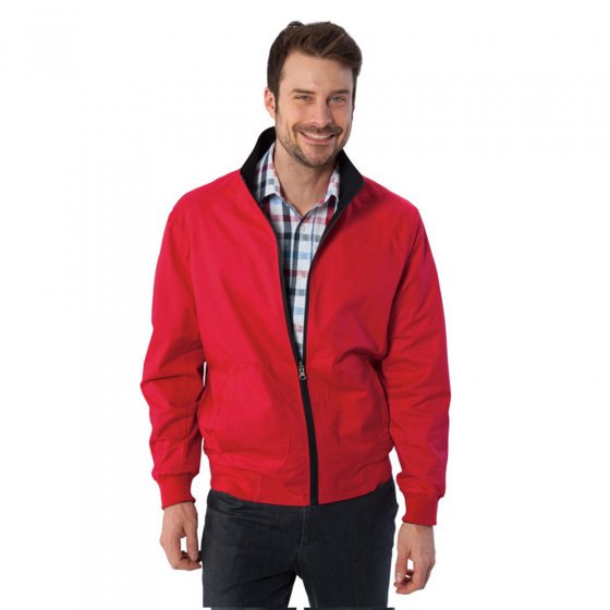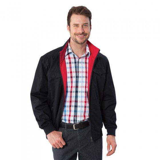 In deze maritieme KATOENEN OMDRAAI BLOUSON steken twee sportieve jacks in één! Klassiek elegant werkt de buitenkant in navy blauw met twee steekzakken en twee borstzakken met knoop-flap. Modieus en elegant is de rode kant. Ook met twee handige zakken! De zuivere natuurlijke vezel geeft de jas een fijne draagbaareigenschappen: hij is temperatuur regulerend, huidvriendelijk en robuust van zichzelf. Gebreide manchetten aan heup en arm en een sta /legkraag maken de mannelijke look perfect. Met ritssluiting. 100% katoen, machine wasbaar. Een multi-talent voor stad, land en zee!