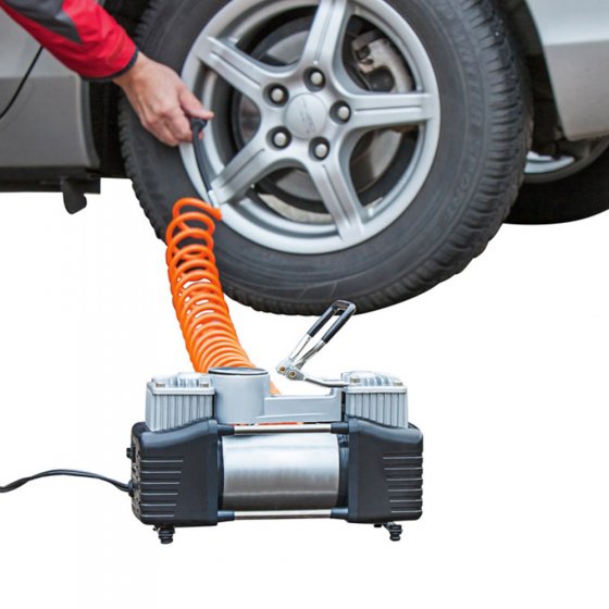 Wie af en toe off-road of op grind of sneeuw met de auto gaat weet dat deflatie de tractie verbetert. Maar: Een te lage bandenspanning is gevaarlijk op de lange termijn! Met de KRACHTIGE DUBBEL COMPRESSOR, kunt u uw autobanden op elk gewenst moment opblazen - onafhankelijk van benzinestations. Het wordt verbonden met de 12-volt sigarettenaansteker (of rechtstreeks op de accu) en drukt per minuut 60 liter lucht in het ventiel ( Werkdruk: 10 bar max, inclusief manometer) Zelfs grote Van- of SUV banden zijn geen enkel probleem! Dankzij diverse adapters kunt u ook met de compressor en luchtbedden, voetballen, opblaasbare boten, etc. opblazen. Afmetingen (L x B x H):ca. 10 x 25 x 14.5 cm. Leveringsomvang: Compressor met 3 m voedingskabel, 5 m spiraalslang, 2 accu klemmen, 3 adapters, nylon draagtas. Maak een grote (in)druk - met twee keer zoveel kracht!