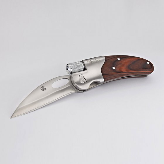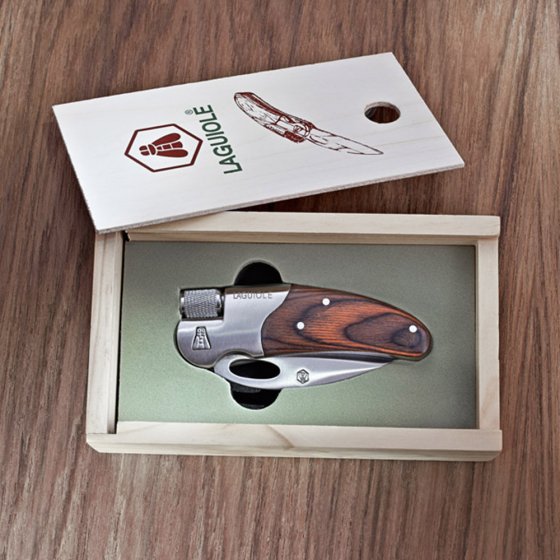 Un couteau tout-terrain aux nombreuses possibilités d'utilisation : il vous rendra de nombreux services en toutes circonstances. Ce COUTEAU LAGUIOLE À LED gravé de la célèbre abeille est encore plus polyvalent que les autres couteaux de sa catégorie : en un tour demain, il se transforme en effet en mini lampe de poche ! Son manche en bois de palissandre tient merveilleusement bien en main et sa lame est en acier chirurgical 440. La LED fonctionne avec une pile-bouton intégrée. Longueur env. 17 cm (ouvert) ou 10 cm (fermé). Ce couteau est livré dans un magnifique coffret en bois. Avec lui, vous êtes paré pour le jour comme pour la nuit !