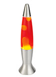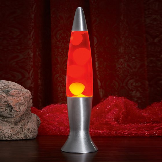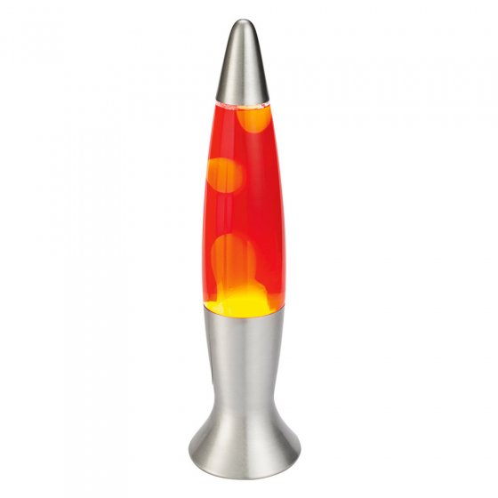 Kent u ze nog - de LAVA LAMP? Het concept van een met gekleurde vloeistof en wax gevulde lamp uit de vroege jaren ’60 stammend en representatief voor de 70er Britse Pop Art thema. In de jaren ’90,herleefde de lavalamp een renaissance - en werd daarmee uiteindelijk een cult-object. Nu is dit cult item weer beschikbaar: De raket-vormige lamp is gevuld met rode vloeistof en gele wax. Voet en deksel zijn gemaakt van geborsteld aluminium, en de vloeistof container is gemaakt van glas. Aangedreven door wisselstroom (230 V). Afmetingen: hoogte ca. 40 cm, diameter ca.10 cm. Beleef uw herinneringen aan de jaren ’70 opnieuw - en plaats deze in het juiste licht!