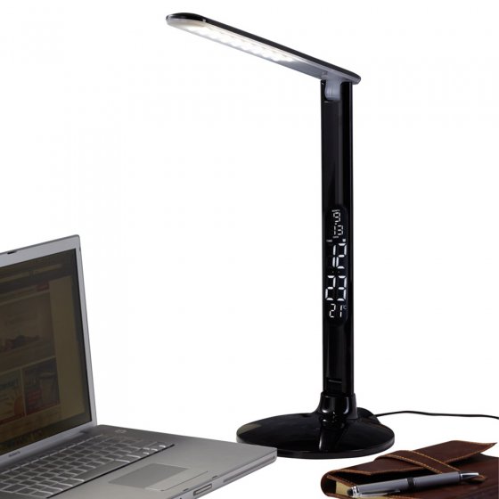 Welke elektronische apparaten heeft u nodig op uw bureau? Een lamp, een digitale klok, misschien zelfs een weerstation of een smartphone laadstation? De 10 W LED-LAMP MET LCD-DISPLAY is de vervanger van al deze apparaten - en biedt ook uitstekend werk of leeslicht, die afzonderlijk kunnen worden geconfigureerd! De configuratie gebeurt via een touch panel op de lamp. Drie kleuren van het licht (koud licht, warm licht, natuurlijk licht) en de vijf niveaus van helderheid om uit te kiezen. Tijd, datum en omgevingstemperstuur worden weergegeven op het LDC scherm; Bovendien heeft de lamp een 5V USB-poort voor het opladen van mobiele telefoons of MP3-spelers. En als u liever in bed wil lezen dan aan het bureau: De geïntegreerde digitale klok heeft een alarm / snooze-functie; de lamp kan dus dienen als een wekker. Bediening via netaansluiting (230 V); Klok en thermometer modus via knoop batterij (inbegrepen). Afmetingen: ca. 19 x 19 x 45 cm. Deze lamp is echt een lichtend voorbeeld van multi-functionaliteit! Efficiëntieklasse: A
