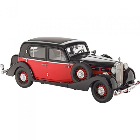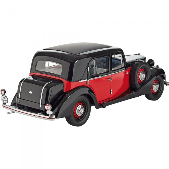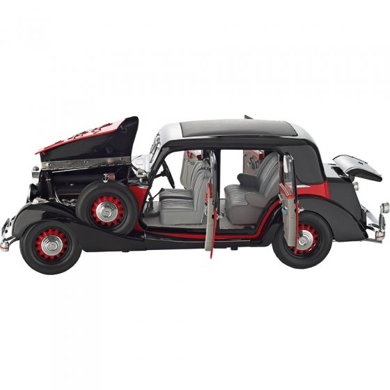 Wie denkt dat het technische concept van de Mercedes SLK een recente uitvinding is, vergist zich. Want al in 1935 bracht de Duitse autofabrikant Maybach met de SW 35 een sportieve en compacte premiumauto op de markt die qua image in niets onderdeed voor zijn royale voorgangers. SW, de afkorting van Schwingachswagen (auto met veeras), refereerde aan de toen innovatieve afzonderlijke wielophanging. Die was zo nieuw dat hij nog niet eens was verwerkt in de grote Maybach Zeppelin. Deze modelauto van de MAYBACH SW 35 LIMOUSINE op een schaal van 1:18 is gemaakt van spuitgietzink met kunststof onderdelen. Het bevat alle details die deze eerste luxe limousine in light-uitvoering zo bijzonder maakten: een bestuurbare vooras, deuren en achterklep die u open en dicht kunt doen en een motorkap waaronder zich een getrouwe weergave bevindt van de 3,5 liter zescylindermotor. Afmeting (l x b x h): ca. 23 x 8 x 10 cm. Deze droomauto is een sieraad voor uw vitrine!