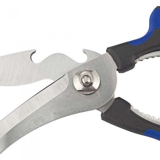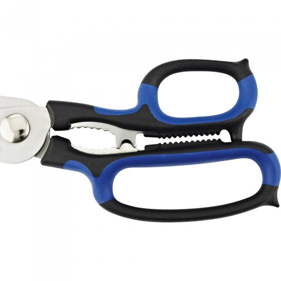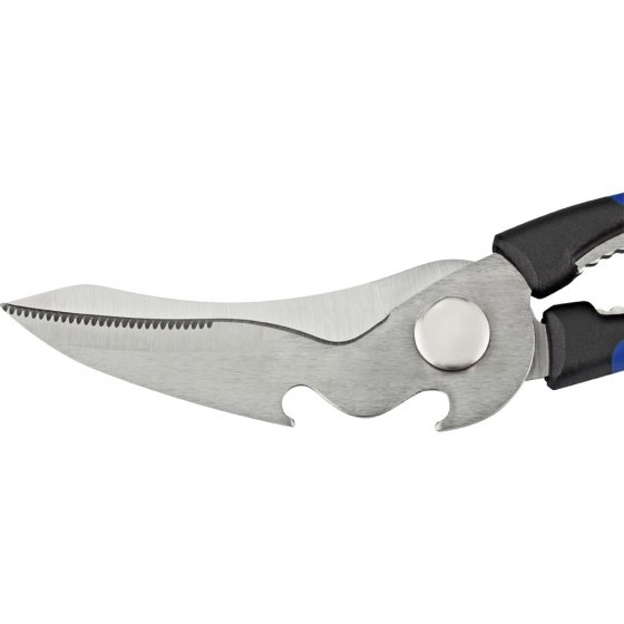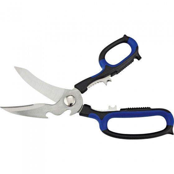 Papier, karton en kipbot knippen, noten kraken, knoflooktenen knijpen, flessen openen en strippen van kabels - hoeveel verschillende tools heeft u hiervoor nodig? Slechts één: de MULTIFUNCTIONELE SCHAAR. Hun bladen zijn gemaakt van gehard staal, kan dus worden gebruikt als ambachtelijke schaar, zoals gevogelte scharen en zelfs als een snoeischaar. Dankzij diverse formaties, ribbels, enz. Hij vervangt bijna een hele gereedschapskist. De grote plastic handgrepen zijn ergonomisch gevormd en zijden neutraal uitgevoerd, de schaar kan dus gebruikt worden door zowel rechtshandig als linkshandig. Comfortabele extra’s: via de centrale schroef kan de klemkracht van de schaar aangepast worden. Afm.:ca. 22,5 x 9,5 x 2 cm. In uw keuken lade is zeker nog ruimte - voor de meest praktische tool die u ooit hebt gehad!