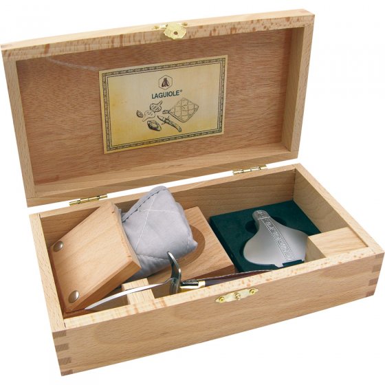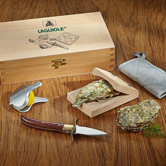Oesters zijn een exotische en gezonde delicatesse: ze bevatten grote hoeveelheden belangrijke sporenelementen, maar ook hormoonsubstanties – waarvan beweerd wordt dat ze een lustopwekkende werking hebben. Om de exclusieve schaaldieren veilig open te kunnen maken en er van te genieten, heeft u het juiste gereedschap nodig. Deze krijgt u met het OESTERSERVIES 'LAGUIOLE': een mes met greep van palissanderhout, een houten schaalhouder, een citroenpers en een doekje. Het servies wordt geleverd in een chique bewaarbox van hout – afm. (lxbxh) ca. 24 x 13 x 7 cm. Open oesters voortaan heel handig en stijlvol!