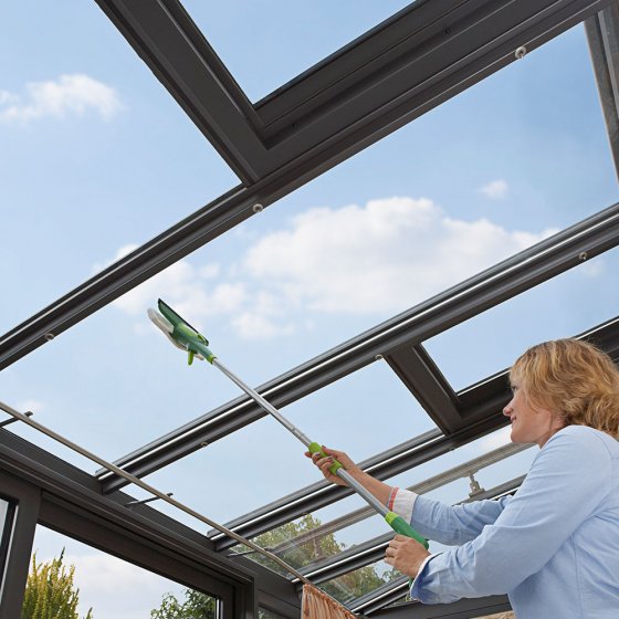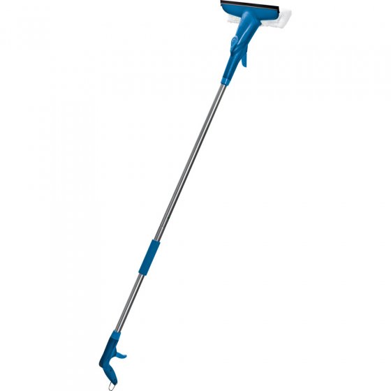 Glasreiniger, vegen, aftrekken: Normaal gesproken zou u drie verschillende gebruiksvoorwerpen nodig hebben en minstens twee handelingen. Met de RAAM SPRAY MOP doet u echter alles in één keer, want het is spray fles, dweil en trekker in één! Bijkomend voordeel: Het kan in een handomdraai worden gecombineerd met een telescopische steel - dus krijgt u zelfs serre glazen fronten moeiteloos in elke hoek schoon. Dankzij een verfijnd mechanisme kan het spray apparaat niet alleen via de voorste spray arm, maar ook met de hendel op de telescopische steel worden bediend. De capaciteit van de spuittank is ongeveer 90 ml. Microvezel mop deksel is beveiligd met een klittenband sluiting aan de mop, kan voor het wassen (tot 30 ° C zonder wasverzachter) gewoon verwijderd worden. Wordt geleverd met een mop. Mop Afmetingen (L x B x H zonder handvat): ca. 29 x 28 x 16 cm. Arm lengte: ongeveer 1.16 m. Niet meer langdurig ramen schoonmaken - wie duidelijk zicht heeft, reikt naar de Spray Mop!