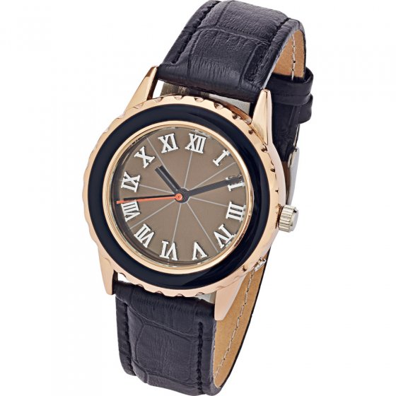Rosé-goud zoals een zonsopgang: RADIOGRAFISCH DAMES-SOLARHORLOGE 'ROSÉ' ziet er al door de kleurstelling van de metalen kast zonnig uit – en geeft daarmee aan wat het uurwerk nodig heeft om te werken. In de wijzerplaat zit namelijk een zonnepaneel verstopt, dat een duurzame accu voedt. Bovendien is het met een radiografisch uurwerk (DCF77) uitgevoerd. Zelden vindt men een sieraad waarbij solar- en draadloze technologie zo charmant gecombineerd zijn. Japans uurwerk, zwart leren bandje, tot 12 maanden donkergangreserve. Kastafm.: Ø ca. 3,8 cm, hoogte ca. 1,2 cm. Het horloge wordt in een representatieve cadeauverpakking geleverd.