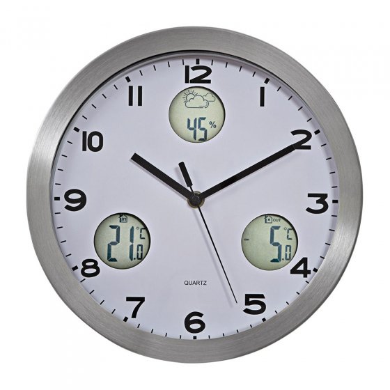 Un coup d’œil à cette HORLOGE RADIOPILOTÉE AVEC STATION MÉTÉO suffit pour connaître la température ambiante, la température extérieure, le taux d’humidité de l’air et la tendance ! La précision est donnée par son radiopilotage DCF77 qui effectue également automatiquement le passage à l’heure d’été et d’hiver. La température extérieure est indiquée grâce à un capteur extérieur résistant aux intempéries à positionner à 30 m max. de la station météo. Le boîtier en aluminium (Ø env. 30 cm) s’adapte à tous les styles. Fonctionne avec 3 piles AA et 2 piles AAA (vendues séparément). Vous pourrez désormais vous fier à cette "grenouille" moderne pour savoir le temps qu’il fait !