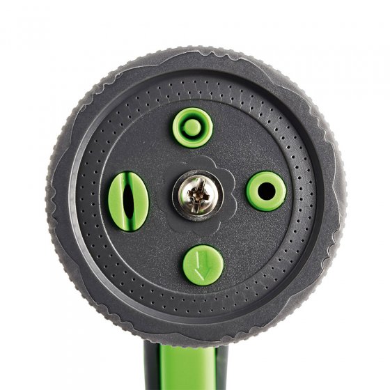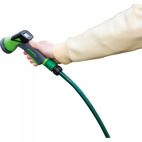 Hoeveel water hebt u verbruikt om het gazon water te geven? En hoeveel water hebben de rozen, geraniums en kruiden gekregen? Het SPUITPISTOOL MET DEBIETMETER geeft de waterstroom precies in liters aan, zowel de enkele stroom als ook de totale stroom na het indrukken van de reset-knop. U kunt ook de waterstraal viervoudig wijzigen door aan het wiel te draaien op de uitlaatmondstukken: als zware regen, als regen, als sproeien of als fijne straal. Het pistool heeft een universele aansluiting die op alle standaard slangkoppelingen past. Afmetingen (L x B x H): ca.12 x 6 x 22 cm. Waterstroom!