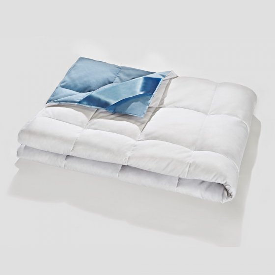 Zelfs in de zomer wilt u zich ’s nachts bedekken - maar het kan snel bij hoge temperaturen kamer onder de dekens erg warm zijn. Resultaat: u zweet hevig; de deken wordt nat. Niet erg prettig! Met het TOP COOL ZOMERDEKBED slaapt u ook op warme nachten goed, want de zomer kant (blauw) bestaat uit een Topcool microvezel stof die afkomstig is van de sportkleding industrie - dit transporteert warmte en vocht weg van het lichaam. In zeer warme zomeravonden, moet de blauwe kant dus worden geconfronteerd met het lichaam. In minder warme nachten gewoon de andere kant (wit) op het lichaam - dan kan het dekbed de lichaamswarmte en vocht nog steeds goed ontvangen; Echter, dat "cooling effect" dan niet meer optreedt. Omdat de vulling van het dekbed is gemaakt van 70 procent dons, is het dekbed ook lekker licht. Afmetingen: ca. 135 x 200 cm. Vulling: 70% witte nieuwe dons, 30% witte nieuwe veren. Beide 1ste klas. Tijk: 100% polyester, blauwe kant met Topcool uitrusting. Met dit dekbed, bent u voorbereid op elk klimaat.
