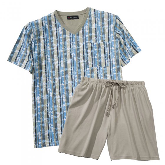 Deze aantrekkelijke ZOMERPYJAMA VAN FIJNE JERSEY belooft u een goede nachtrust! Het materiaal van 100% katoen laat het lichaam ademen en is van nature bewegingselastisch. Het handige ½ armshirt in streepjesdesign met allover-print heeft een v-hals en borstzak. De unigekleurde broek wordt geleverd met een elastische tailleband en verstelbare band. Geschikt voor machinewas.