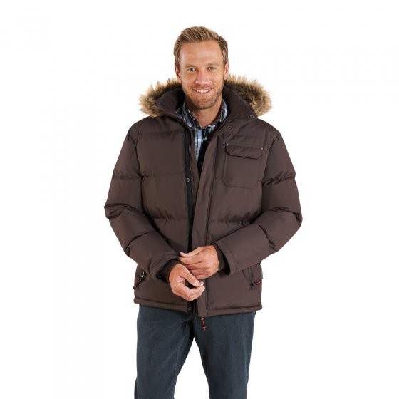 Dit doorgestikte NYLONJACK IN DONS-LOOK is een ideaal wintermodel voor de man van nu! De warme wattering beschermt heel efficiënt tegen wind en kou, de robuuste buitenkant is waterafstotend en laat vocht er in druppels afrollen. De capuchon (afneembaar) met beleg van imitatiebont vormt een winters accent. Dit outdoorjack is uitstekend verwerkt met zachte tricot-inzet in de kraag, elastische gebreide boord in de mouwranden, borstzak met drukknoop, 2 ritssteekzakken en 2 binnenzakken. Met ritssluiting en blinde drukknoopsluiting. Buitenkant en gewatteerde voering van 100% polyester.