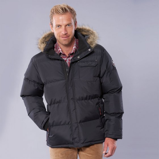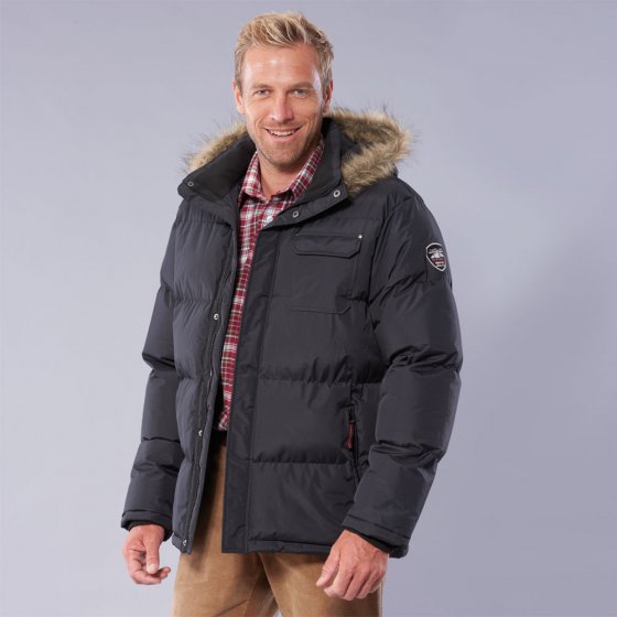 Dit doorgestikte NYLONJACK IN DONS-LOOK is een ideaal wintermodel voor de man van nu! De warme wattering beschermt heel efficiënt tegen wind en kou, de robuuste buitenkant is waterafstotend en laat vocht er in druppels afrollen. De capuchon (afneembaar) met beleg van imitatiebont vormt een winters accent. Dit outdoorjack is uitstekend verwerkt met zachte tricot-inzet in de kraag, elastische gebreide boord in de mouwranden, borstzak met drukknoop, 2 ritssteekzakken en 2 binnenzakken. Met ritssluiting en blinde drukknoopsluiting. Buitenkant en gewatteerde voering van 100% polyester.
