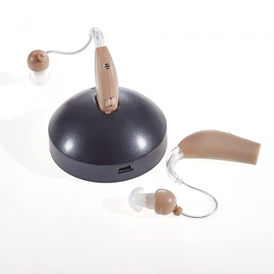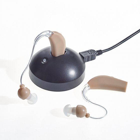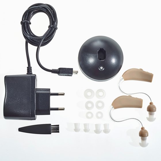 Heeft u het gevoel dat u slecht hoort? Met dit onopvallende OPLAADBARE HOORTOESTEL verbetert u uw hoorvermogen enorm: geluiden kunnen met de gepatenteerde microprocessor tot 30 keer traploos versterkt worden! En anders dan gewone apparaten zijn voor dit hoorapparaat geen batterijen benodigd – een geïntegreerde accu zorgt voor maximaal 10 uur gebruiksduur! Een snellaadstation met twee hoorapparaten is inbegrepen, zodat u bij een zwakkere accu gewoon het andere hoorapparaat kunt pakken. Daarbij worden 12 verschillende oordopjes van zachte silicone en een netadapter meegeleverd. Afmeting behuizing (l x b x h, zonder oorinzet): ca. 1,5 x 0,8 x 4,2 cm. Vanaf nu bent u tijdens gesprekken weer een en al oor.