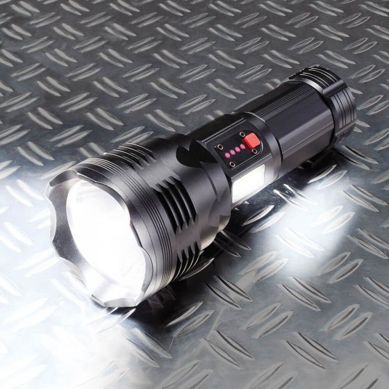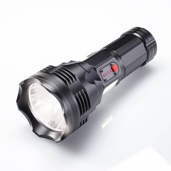 Compact, robuust en uitgevoerd met extra helder licht. Daarmee verdrijft deze OPLAADBARE MULTIFUNCTIONELE POWERLAMP de duisternis. De 36 W sterke lamp aan de voorkant vormt een lichtbundel met een enorme helderheid en reikwijdte, aan te passen in 3 standen (fel licht, normaal licht, flitslicht). Aan de zij- en achterkant bevinden zich eveneens leds – deze zorgen voor een optimale verlichting van het oppervlak. Dankzij de infraroodsensor aan het eind is de lamp ook te gebruiken als nachtlampje – één beweging is voldoende om het licht aan te laten gaan. De 4-voudige ledindicatie geeft op elk moment informatie over de laadstand van de oplaadbare Li-ion accu (8000 mAh, incl. USB-oplaadkabel). De aluminiumbehuizing is stof- en spatwaterdicht (IP65). Afmetingen (l x b): slechts ca. 21 x 8 cm. Met deze lamp zorgt u voor uitstekende licht- en zichtcondities!