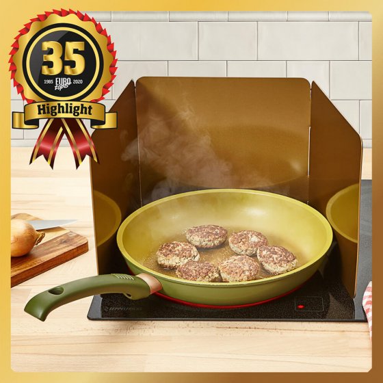 Hobbykoks en huisvrouwen gebruiken hem al decennialang: het OPVOUWBARE SPATSCHERM voor oven of grill. Geen wonder – het metalen frame met scharnieren bespaart bij het koken veel schoonmaken! Als u het scherm tussen de pan en de muur plaatst, wordt op een uiterst eenvoudige manier voorkomen dat vetspetters en saus op de kookplaat en de muur terechtkomen. Dankzij de antiaanbaklaag is het spatscherm moeiteloos te reinigen, en natuurlijk kan het scherm ook in de vaatwasser. Materiaal: hoogwaardig ijzerstaal met koperkleurige coating. Afmetingen (b x h, opengeklapt): 75 x 23 cm. Ook ideaal voor een gasbarbecue met kookplaat opzij, voor het afschermen van de pan!