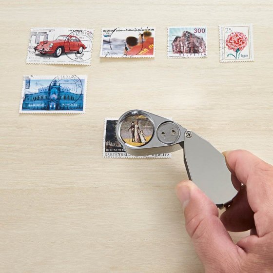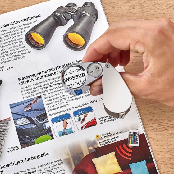 Snel even de ingrediënten op de verpakking in de supermarkt lezen: zonder vergrootglas is dat soms nauwelijks mogelijk. Dan komt dit OPVOUWBARE VERGROOTGLAS MET VERLICHTING goed van pas. Omdat het vergrootglas in de metalen behuizing te klappen is, past deze mooi in uw broekzak – u kunt het vergrootglas dus overal mee naar toe nemen. Met één druk op de knop biedt het vergrootglas met 10-voudige vergroting een schakelbare ledverlichting. Zo hebt u op elk moment van de dag het perfecte uitzicht. Afmetingen (b x l x d): ca. 2 x 11 x 3 cm. Diameter loep: ca. 25 mm. Ideaal voor knutselaars, bouwers van modelvoertuigen, puzzelaars en postzegelverzamelaars of om cadeau te geven.