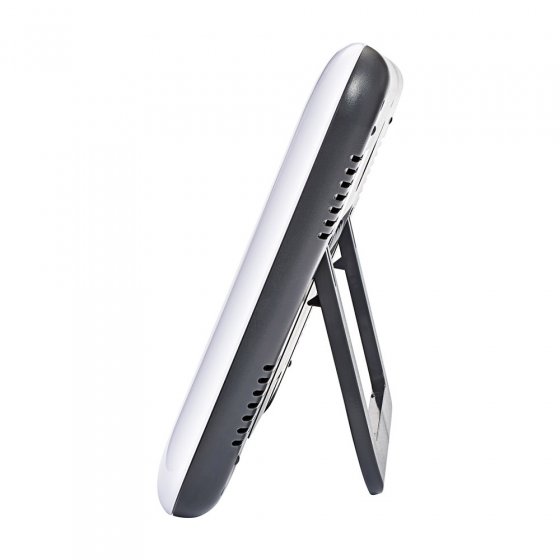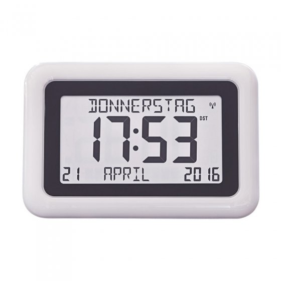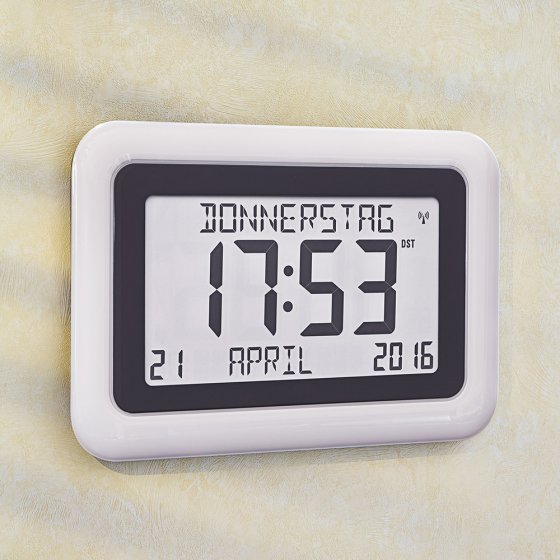 Cette PENDULE RADIO-PILOTÉE GRAND FORMAT AVEC CALENDRIER séduit par son affichage clair et informatif, facilement lisible de loin. Elle est toujours exacte grâce à la mise à l’heure automatique par signal radio DCF77. Le passage à l’heure d’été ou d’hiver est également automatique. La pendule est dotée d’un calendrier perpétuel jusqu’à 2099; le jour et le mois peuvent être affichés en 8 langues différentes. À fixer au mur ou poser sur un meuble. Fonctionne avec 2 piles AA (vendues séparément). Dimensions (P x H x l) env. 3 x 19 x 28 cm. Le format de l’écran LC (diagonale env. 21 cm) est vraiment impressionnant – un coup d’œil suffit !