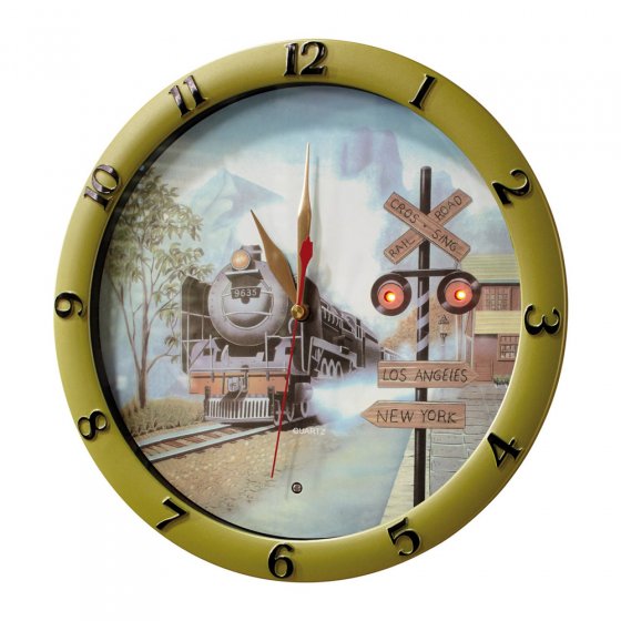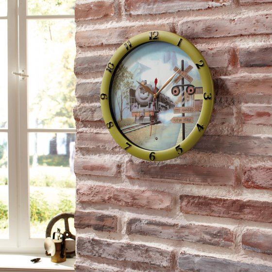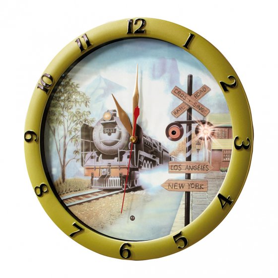 A chaque heure pleine, cette PENDULE TRAIN NOSTALGIQUE instaure une belle ambiance de chemin de fer : la locomotive émet son "tchou tchou" caractéristique ainsi qu’un sifflement – et les roues vibrent en rythme sur les rails tandis que les témoins lumineux clignotent en rythme. Avec mouvement à quartz et capteur intégré afin que le son ne retentissent qu’en plein jour ou lorsqu’une lumière est allumée dans la pièce. Fonctionne sur 3 piles LR 56 AA (disponible séparément). Ø 30 cm. Un vrai régal pour les yeux et les oreilles, un très beau cadeau pour les collectionneurs et les amis du chemin de fer !