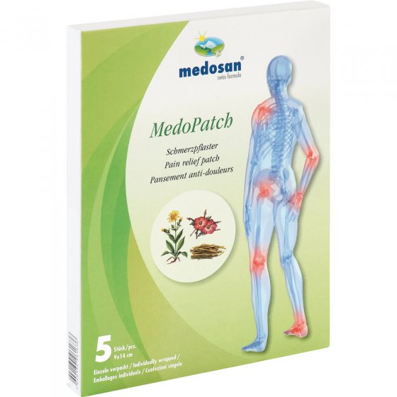 1. Zakje openen en de pleister uitnemen. 2. De transparante beschermfolie verwijderen. 3. De pleister op de desbetreffende plaats op het lichaam aanbrengen en zorgvuldig aandrukken. De pleister 24 uur laten inwerken en daarna eventueel vervangen door een nieuwe. De pleister kan met de schaar op maat worden gesneden als er een kleiner formaat nodig is. Gebruik geen MedoPatch gedurende een periode van meer dan 4 opeenvolgende dagen.