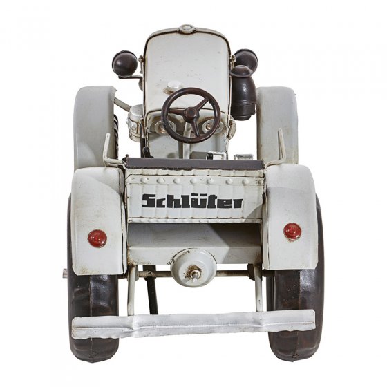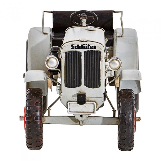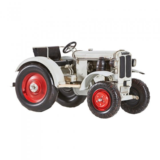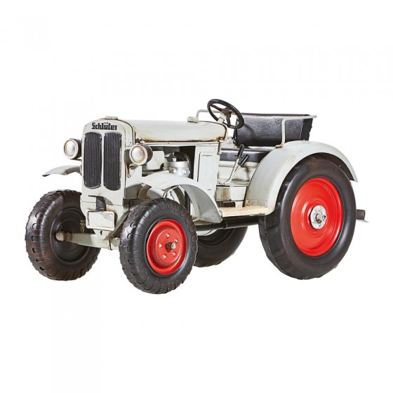 Schlüter-tractoren worden al sinds de jaren 30 van de vorige eeuw in de landbouw gebruikt. De DS 15 met 15 pk, gebouwd vanaf 1950, werd net na de oorlog geproduceerd. Heel veel kleine boeren hadden in die tijd behoefte aan een kleine, economische tractor met een kleine motor die universeel inzetbaar was. Deze PLAATSTALEN TRACTOR 'SCHLÜTER' DS 15 is een geheel met de hand vervaardigd en beschilderd model en maakt een uitstekende indruk door de rustieke look, die nog eens versterkt wordt door de zichtbare roestsporen. De wielen – die net als de carrosserie geheel zijn vervaardigd van plaatstaal – en het stuur zijn volledig draaibaar. Afm. (lxbxh): ca. 28x15x15 cm. Welke verzamelaar kan zo'n charmant metalen kunstwerk nou weerstaan?