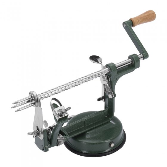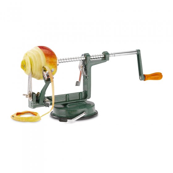 Des rondelles de pomme parfaites en cinq secondes seulement ? Pas de problème pour l’ÉPLUCHEUR DE POMMES À MANIVELLE ! Beaucoup connaissent cet appareil génial de leur enfance – et depuis, il est resté irremplaçable et inégalé ! Il suffit d’embrocher la pomme et de tourner la manivelle. L’appareil pèle la pomme en un clin d’œil, élimine le trognon et découpe en spirale des rondelles de même épaisseur. Pour les tartes aux pommes, les fruits secs, le muesli, les salades de fruits et les décorations – vous ne voudrez plus vous passer de cet éplucheur ! Vous voulez seulement peler les pommes ? Pas de problème - il suffit de rabattre le couteau !Convient aussi pour les pommes de terre, les radis et les poires. Entièrement en métal robuste. Longueur, manivelle comprise : env. 31 cm. L’appareil tient fermement en place sans glisser grâce au pied à ventouse avec levier de blocage. L’épaisseur des rondelles est réglable. Le nettoyage est très facile : la lame d’épluchage et le vide-pomme sont facilement amovibles. Heureusement que certaines choses ne changent pas au cours d’une vie – parce qu’elles sont incroyablement pratiques !