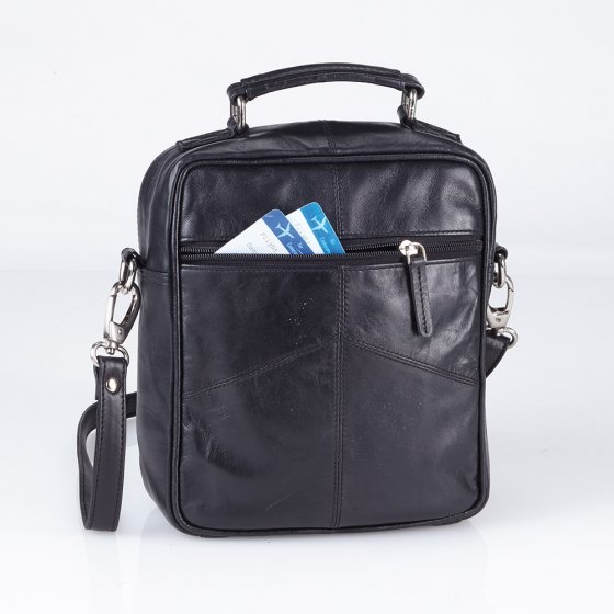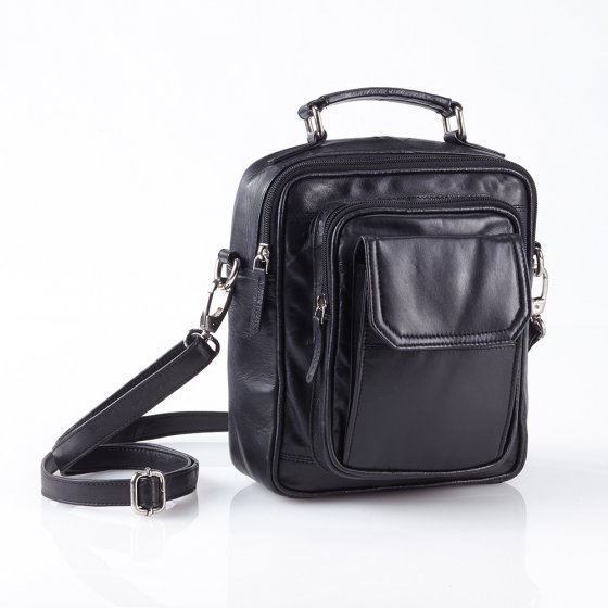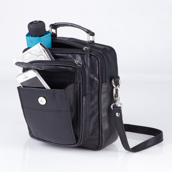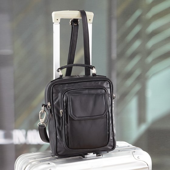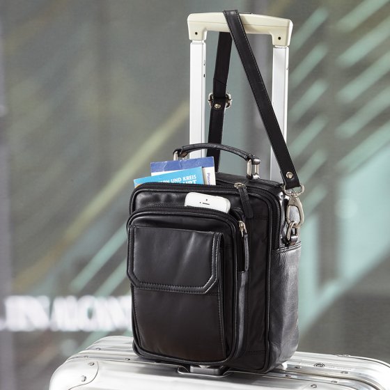Parfait pour les vacances, les excursions et les escapades urbaines : la POCHETTE DE VOYAGE EN CUIR NAPPA d'allure intemporelle et avec protection anti-RFID offre suffisamment de place pour vos ustensiles de voyage ! Dans la poche avant à fermeture magnétique, vous pouvez ranger aisément un grand téléphone portable pour l'avoir à portée de main. Les deux autres poches extérieures et les poches zippées à l'intérieur et au dos sont un rangement sûr pour les documents de voyage, le porte-monnaie et les clés. Le sac de style classique et élégant en cuir souple de mouton se porte à la main par sa poignée ou par la bandoulière ajustable fournie. Dimensions (L x l x H) : env. 11 x 20 x 28 cm. Un accessoire compact et raffiné dont vous ne voudrez plus vous passer pour vos voyages !