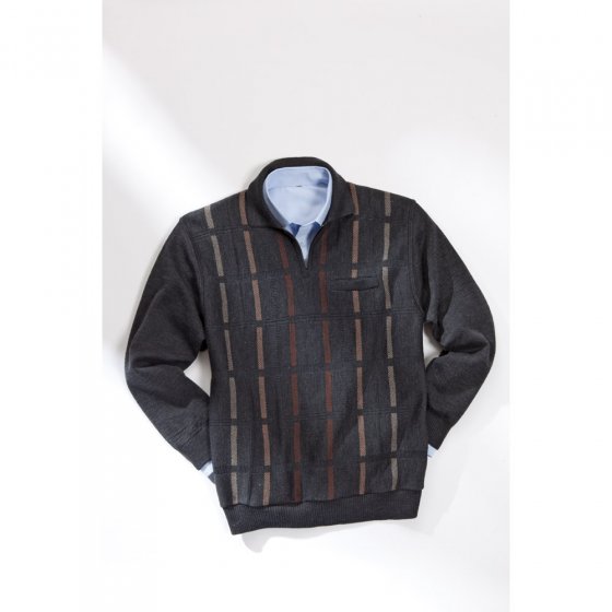 L’atout incontestable de ce pull est sa poche intérieure cousue ultra pratique. Son motif jacquard vertical arbore les nouvelles couleurs de l’automne rouille et beige. Le contraste avec la couleur de fond anthracite chinée est du plus bel effet. La forme avec col polo et fermeture éclair est très seyante : vous pourrez sans souci porter ce PULL POLO AVEC POCHE POITRINE ouvert sur une chemise. Le mélange de fils de qualité composé en grande partie de laine procure une chaleur et une douceur agréables. Grâce à l’ajout de fibres synthétiques, il est également résistant, indéformable et facile à entretenir. Nous vous garantissons que vous conserverez ce pull très longtemps ! Dos et manches de couleur unie, bords-côtes élastiqués aux bras et au bas, 50 % laine, 50 % polyacrylique, lavable en machine. Un superbe pull à porter avec tout dans une qualité qui se voit et qui se sent !