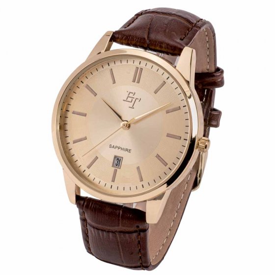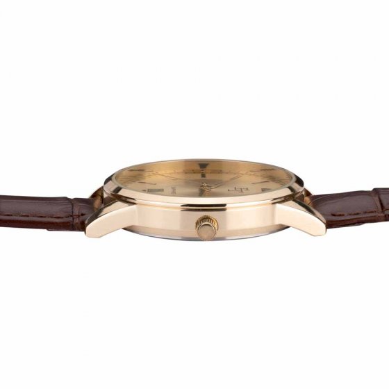 Het POLSHORLOGE ”GOUDEN TIJD" straalt met zijn edele uiterlijk stabiliteit, helderheid en betrouwbaarheid uit. De klassiek vormgegeven wijzerplaat is aangenaam overzichtelijk en gemakkelijk af te lezen. De platte van huidvriendelijk roestvrij staal glijdt gemakkelijk onder de mouw van elk overhemd of jasje. Waterdicht tot 1 ATM. Materiaal: Roestvrij staal, glas, leder, imitatieleder. Kleur: goud, bruin (horlogebandje). Gewicht: 39 g. Afmetingen (l x Ø): ca. 24 x 4 cm. Het polshorloge is een ideale metgezel voor het dagelijks leven en feestelijke gelegenheden!