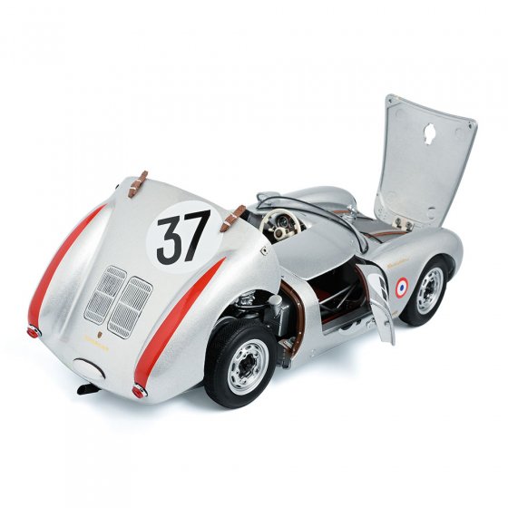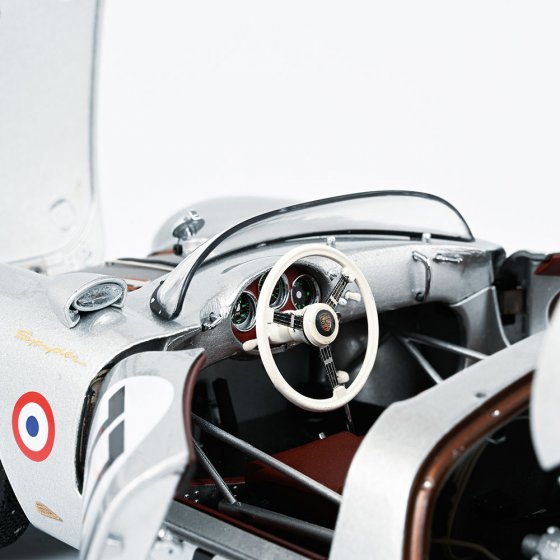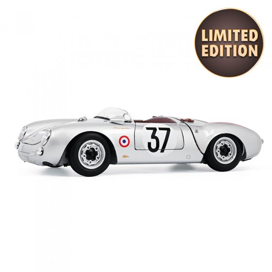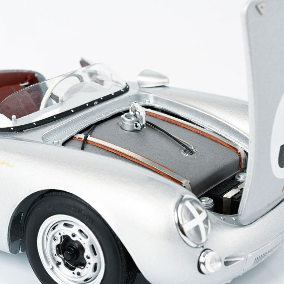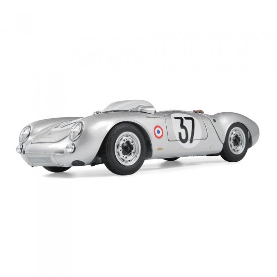 Begin jaren 50 ontwikkelde Porsche de eerste echte raceauto van het merk. Het resultaat, de 550 Spyder, overtuigde in 1955 direct bij de 24 uur van Le Mans en kreeg kort daarop goedkeuring voor de weg. De meest prominente amateurracer was de Amerikaanse acteur James Dean, die de kitcar definitief tot een legende maakte. Nu is de PORSCHE 550 SPYDER #37 in de Le-Mans-versie als gelimiteerd 1:18 schaalmodel te bestellen. De carrosserie draagt het startnummer van Le Mans uit 1955, de motor en het interieur zijn tot in het detail volgens het origineel nagemaakt. Afmetingen (l x b x h): ca. 20 x 9 x 4 cm. Wie een zwak heeft voor auto’s met een legendarische status wil dit model zeker niet missen.