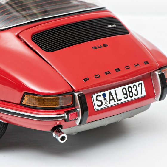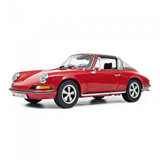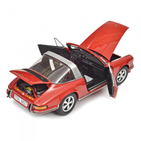 Met de aanduiding 911 verscheen in 1963 een echte iconische sportwagen op de markt: de PORSCHE 911 S TARGA. Met dit model van zinkdrukgietwerk haalt u een meesterwerk uit de autoindustrie in huis. De op 911 stuks gelimiteerde mini-uitvoering op schaal 1:18 heeft draaibare wielen, een bestuurbare vooras en deuren, en een motorkap en voorste deel die geopend kunnen worden. Bekijk de miniatuur-uitgave van de 6-cilinder-boxermotor, die in het echt een vermogen van 190 pk had. Het afneembare dak en de authentieke hoogglanslak zijn gewoon schitterend. Afmetingen (l x b x h): ca. 23 x 9 x 7 cm. Met aanbouwelementen van kunststof. Een collector’s item voor elke liefhebber van sportwagens.