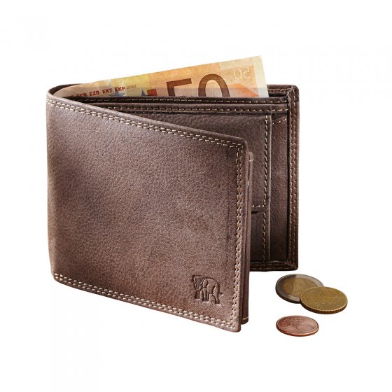 ... bien au contraire : il devient de plus en plus beau au fil des années ! La matière et les finitions de ce PORTE-MONNAIE EN CUIR témoignent de son excellente qualité et de sa durabilité. Son daim sportif et robuste à surpiqures apparentes tient bien en main et sera de toutes les aventures. L'intérieur est doté de deux fentes à billets et d'un compartiment à pièces à bouton pression. Les 8 fentes à cartes se ferment également par un bouton pression, ainsi que les 3 poches transparentes pour vos papiers d'identité. Un compartiment secret et fermé par zip est également disponible. Avec ses dim. compactes (env. 13 x 10 cm), il tient dans une poche sans la déformer. Que ce soit à la station-service, au comptoir d'enregistrement d'un aéroport ou au restaurant, avec ce porte-monnaie vous arriverez toujours à vos fins !