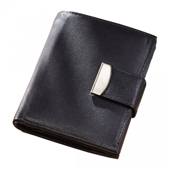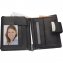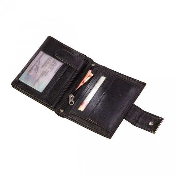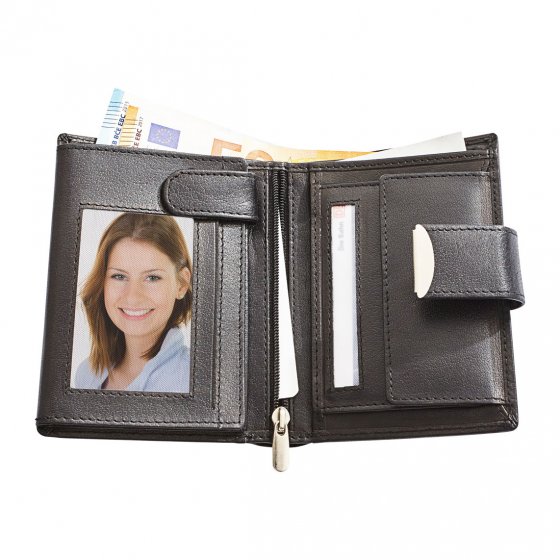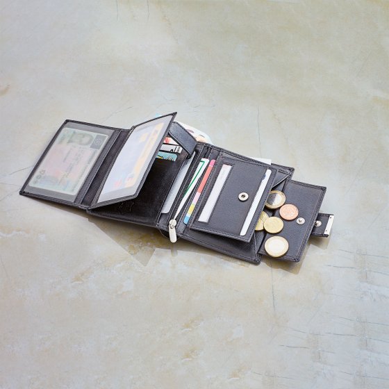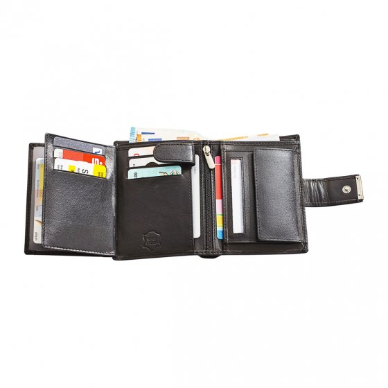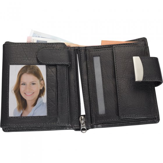 - 8 espaces de rangement pour cartes, 4 compartiments à fenêtre, double compartiment pour billets, poche pour monnaie