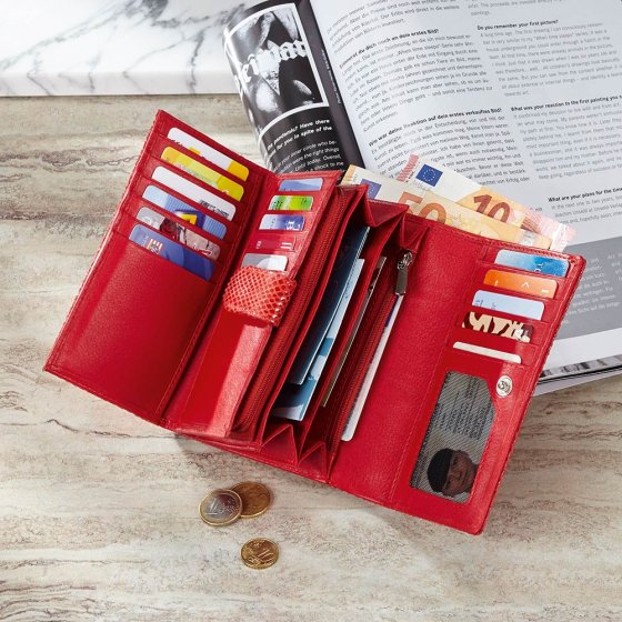 Plus besoin de fouiller partout dans votre sac pour le trouver : le PORTE-MONNAIE EN CUIR POUR FEMME tape tout de suite à l'œil. Le portefeuille spacieux est en cuir de buffle haut de gamme teinté en cuve. La surface au look reptile brille d'un rouge intense. L'agencement compact comprend une grande poche pour les billets, 17 emplacements pour cartes (dont un avec fenêtre), une poche zippée et divisée en deux pour la monnaie et divers compartiments (zippés). Il y a de la place pour tout ce dont une femme peut avoir besoin. Protection anti-RFID. Dimensions (L x l x H) : env. 15 x 10,5 x 3,5 cm. Ça donne envie de sortir passionnément son porte-monnaie !