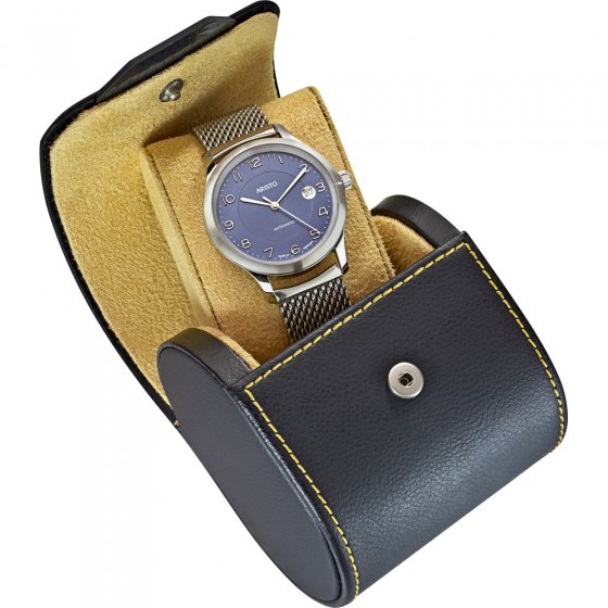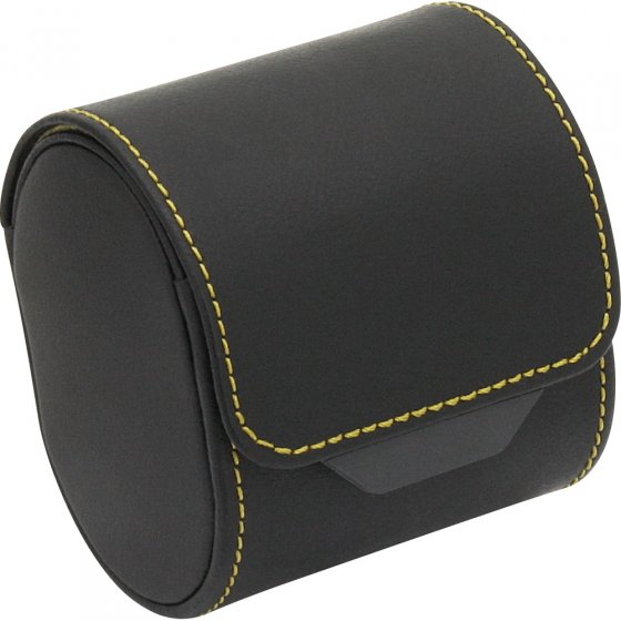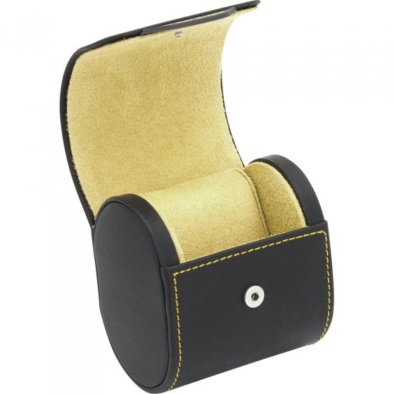 Vous possédez une montre qui revêt une valeur particulière à vos yeux ? Protégez-la de la poussière et des rayures chez vous ou dans votre valise par exemple ! Ce PRÉSENTOIR CYLINDRIQUE POUR MONTRES, en cuir véritable décoré de coutures claires contrastantes, protège votre montre : faites glisser le bracelet de votre montre sur le coussin souple, remettez-le dans le cylindre et fermez le couvercle du cylindre pour transporter et ranger votre montre en toute sécurité. L'onglet de caoutchouc sur le couvercle du boîtier facilite l'ouverture du cylindre. Dim. (L x l x h) : env. 8,5 x 7 x 9,5 cm. Conseil : ce cylindre permet aussi de ranger vos bracelets !