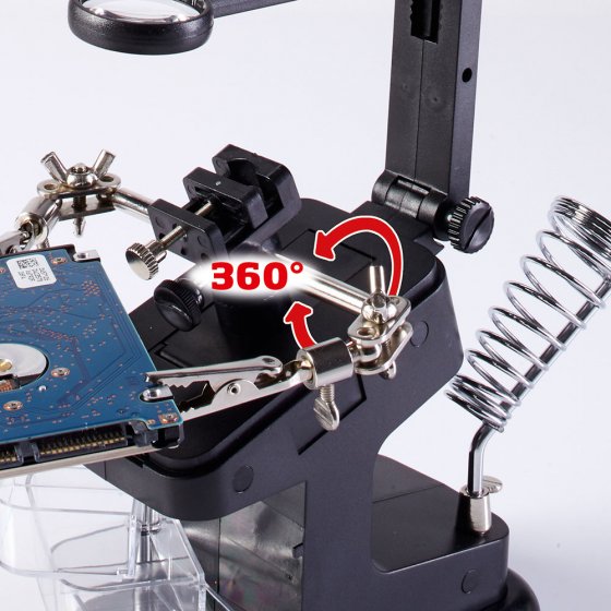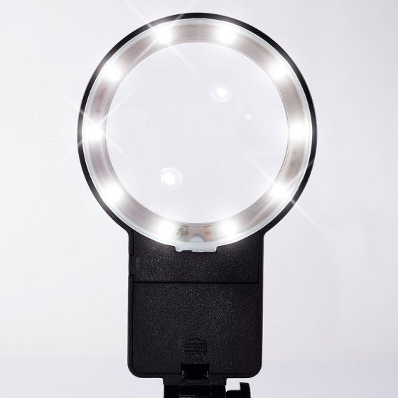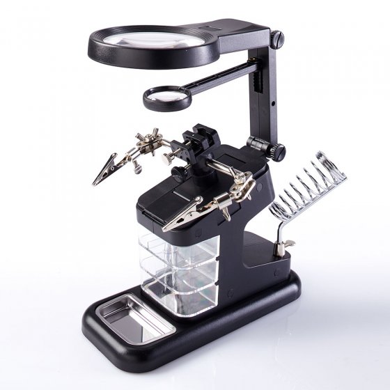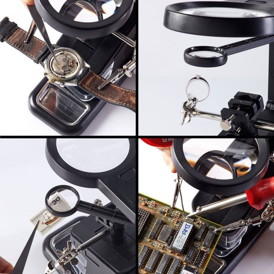 Het is de perfecte allrounder bij precisiewerk zoals solderen of fijnmechanische reparaties: de PRECISIE-LOEPLAMP. Een hoofdlens Ø 7,3 cm met geïntegreerde fijne lens, gemonteerd op een scharnierende arm, en een extra, zwenkbare lens zorgen voor een enorme vergroting naar behoefte. 10 leds zorgen voor fel licht met een druk op de knop. Twee fixatietangen op een verstelbare houder houden elk klein voorwerp in de gewenste positie; handiger kan niet. Afmetingen (b x h x d): ca. 19 x 24 x 8 cm. Lamp werkt op 3 AAA-batterijen (apart verkrijgbaar) of via USB-kabel (meegeleverd). Zo komt elk detail aan het licht bij het repareren, verzamelen of knutselen!