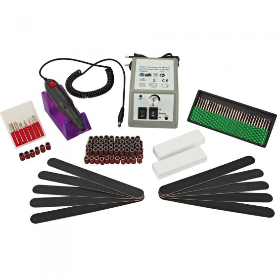 U wilt graag nette vinger-en teennagels hebben, maar u wilt niet om de twee weken naar een dure nagelsalon gaan? Met de PROFESSIONELE MANICURE EN PEDICURE SET kunt u zelfs uw nagels in perfecte staat: verkorten, slijpen, vijlen en polijsten - alles is met deze tool set van de nieuwste generatie mogelijk. 30 verschillende Diamantfreeskoppen, 10 vijlen, 2 vijlblokken en 100 slijpopzetstukken bieden garanties voor een "uitstekend resultaat". Het micromotor apparaat is dankzij zijn slanke vorm en dankzij het lage gewicht van minder dan 1,5 kg comfortabel in de hand - u kunt heerlijk nauwkeurig werken. De router zowel links als rechtsdraaiend bediend worden, de snelheid is maximaal 20.000 omwentelingen traploos instelbaar. Bediening via netspanning (230 V). Vermogen: 10 watt. Deze professionele set geeft eigen nagelverzorging werkelijk "handen en voeten"!