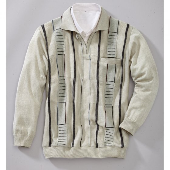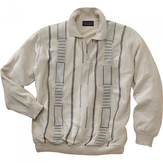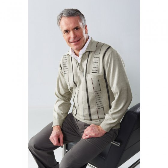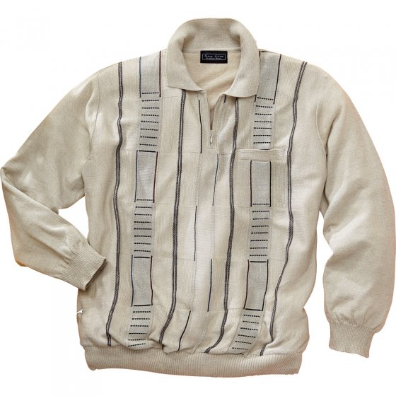 Sa superbe forme intemporelle, accompagnée d'un col polo, d'une fermeture éclair et d'une poche poitrine, témoigne de son élégance décontractée tout en étant très confortable. Le tricot Jacquard joliment travaillé apporte une touche très intéressante avec ses motifs à rayures et carrés dans les tons beiges. Ce tricot, réalisé d'une main de maître, assure un effet luxueux! Son mélange de matières estival (50% coton, 50% polyacrylique) est doux et laisse respirer la peau tout en étant agréablement chaud. Idéal pour le printemps ou les soirées un peu fraîches de l'été! Ce PULL POLO EN JACQUARD est facile d'entretien, résistant et se porte avec tout: vous serez ravi de constater qu'il conserve parfaitement sa forme ! Dos et poignets unis, bords-côtes élastiqués au niveau des poignets et des hanches, lavable en machine. Un pull facile à assortir pour les hommes modernes appréciant la qualité, le confort et le style!