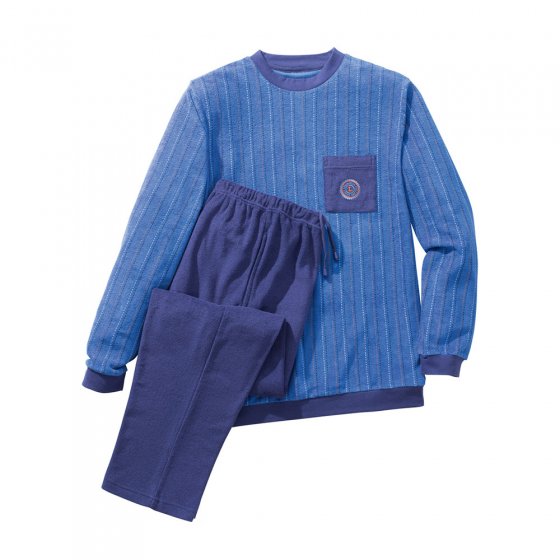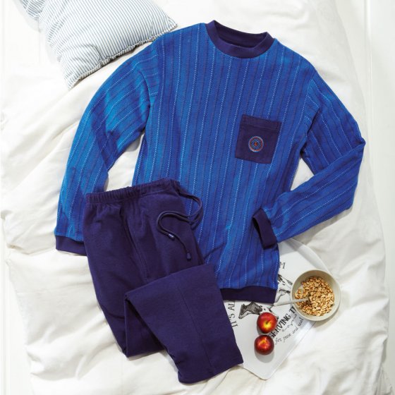 Gewoon aantrekken en relaxen maar: in deze PYJAMA VAN BADSTOF ligt u zo in Morpheus' armen. De hoogwaardige stof van 80% katoen en 20% polyester is aangenaam warm en voelt superzacht aan. De elastische stof biedt veel bewegingsvrijheid, blijft bovendien in model en kan in de wasmachine. Model en afwerking zijn zeer verzorgd: shirt met gestikte borstzak, contrasterende effecten en elastische boordjes aan de mouwen en heup. Broek met een recht model, elastische band en koordje plus 2 steekzakken. Een uiterst hoogwaardige pyjama, die ook zeer geschikt is als huispak!