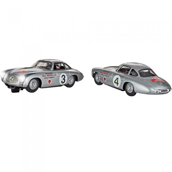 De ”Carrera Panamericana” door Mexico is een van de meest legendarische - en meest gevaarlijke - autorace ter wereld . Onvergetelijk is nog steeds de overwinning van Karl Kling en Hans Klenk in 1952 : Nadat een gier door de voorruit van de 220 km / h snelle auto vloog en passagiers Klenk had gekwetst, waren nog tijdens de race de gelaste stalen staven in de voorruit. Zonder voorruit, maar met zicht verhinderende raster in zichtveld , won Kling nog steeds de race na slechts 19 uur. Met de AUTO RACE BAAN PANAMERICANA haalt u deze wedstrijdracebaan recht in uw woonkamer : Op een XXL- baan met een lengte van zeven meter geeft u de Mercedes 300 SL na bijna 60 jaar later weer de sporen. Start gratis! De twee voertuigen in de originele Mercedes racetrim worden herschapen op schaal 1:24. De baan heeft de vorm van een acht met vijf super rechte stukken van 69 cm . Opbouw Afm. : ca. 176 x 314 cm. Besturing door 2 speed controllers, die werken op een 18 V transformator. En ’s nachts, is het spoor volkomen verlicht door de functionele koplampen!