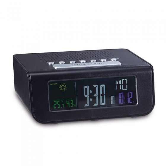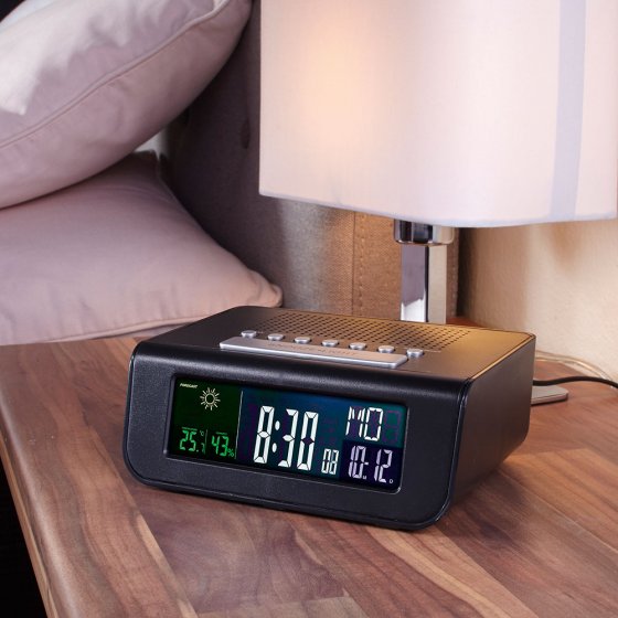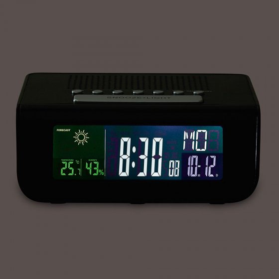 Grâce à ce RADIO-RÉVEIL AVEC STATION MÉTÉO vous savez dès le matin si votre journée sera ou non ensoleillée ! Réveillez-vous au son de la musique ou avec la sonnerie du réveil et servez-vous de la fonction de répétition pour vous rendormir pendant quelques minutes. Jetez ensuite un coup d'œil sur l'écran bien lisible en 4 couleurs pour vous renseigner sur l'heure, la date, le jour de la semaine et les données météo importantes. Muni de toutes les informations sur la température ambiante, l'humidité de l'air et la tendance météo, vous n'aurez aucun mal à choisir la tenue adéquate ! Le radio-réveil fonctionne sur secteur 230 V ou avec 3 piles AA (vendues séparément). Dimensions (L x l x H) : env. 11 x 14 x 5 cm. Matière plastique. Sachez dès le réveil ce qui vous attend au cours de la journée !