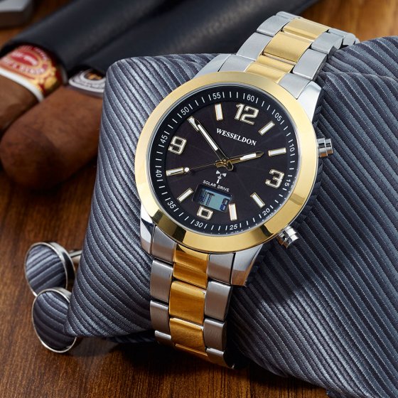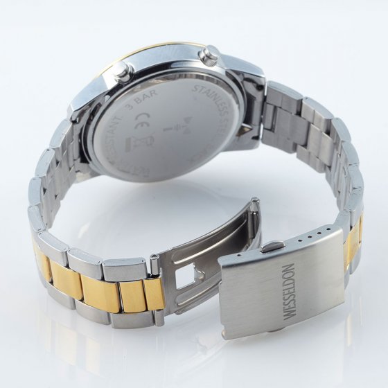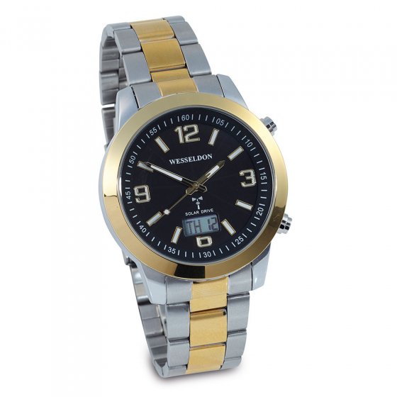 Wilt u graag een horloge dat het gewoon altijd doet, en wel zo nauwkeurig dat u nooit de tijdsinstelling hoeft aan te passen? Dit RADIOGRAFISCHE SOLARHORLOGE 'BICOLOR' is er zo een. Het kwartsuurwerk werkt op een accu, die zich elke dag via zonnecellen in de wijzerplaat opnieuw oplaadt. U hoeft dus nooit de batterij te verwisselen. Dankzij de DCF77-tijdsignaalontvangst is de tijdsaanduiding bovendien altijd correct, en ook de digitale secondeaanduiding in het lcd-scherm klopt voor 100%. De kast is gemaakt van verchroomd metaal, de schakelarmband is van edelstaal. Afmetingen: Ø ca. 43 mm, kastdikte ca. 12 mm. Voortaan hebt u op elk moment de juiste tijd, daar kunt u de klok op gelijkzetten.