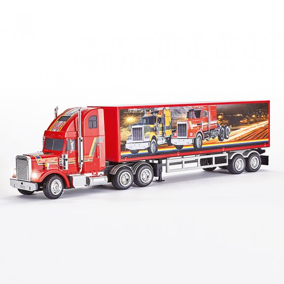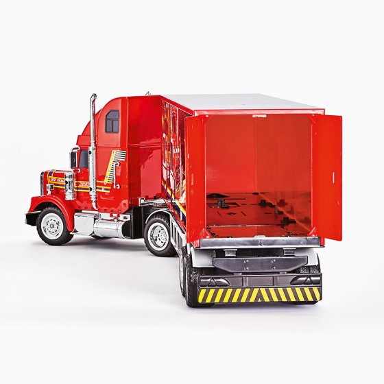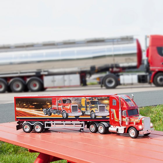 Welke man of jongen droomt er niet van in een XXL-truck de highways te veroveren en te genieten van een grenzeloze vrijheid? Met deze extra lange RADIOGRAFISCHE JUMBO-TRUCK wordt deze droom ook thuis waar. Ervaar zelf hoe de truck in beweging komt en de koplampen branden onder het rijden. Deze 70 cm lange krachtpatser op een schaal van 1:20 rijdt vooruit, achteruit, links, rechts. De aanhanger is afkoppelbaar en zelfs de achterkleppen kunnen worden geopend. Afmetingen (l x b x h): ca. 70 x 12 x 20 cm (incl. aanhanger). Werkt op een 9 V-blokbatterij en 5 AA-batterijen (afzonderlijk te bestellen). Start de truck en begin aan een enorme trip!