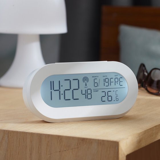 Wilt u ‘s nachts weten hoe laat het is? De RADIOGRAFISCHE KLOK 'WHITE DREAM' toont u de tijd met één druk op de knop, met contrastrijke witte achtergrondverlichting. Bovendien toont hij u de datum, dag van de week en de temperatuur in de kamer. Werkt op 2 AAA-batterijen (afzonderlijk te bestellen). Afmetingen (b x h x d): ca. 14 x 7 x 3 cm.