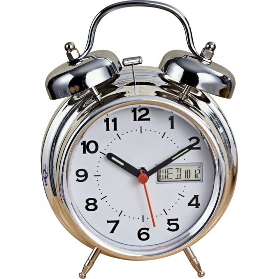Hoe laat u zich wekken- met digitale klok gepiep? Of file berichten op de radio? Als u het goede oude wekker geluid terug wenst: Alstublieft - de RADIOGRAFISCHE NOSTALGIE WEKKER genereerd met zijn dubbele bel een heerlijk ouderwets rinkelen! In tegenstelling tot wat zijn 'ouderwetse' look suggereert, werkt binnenin geen klein meachanisch uurwerk , maar een elektronisch uurwerk met DCF77 radiografischemodule - waardoor het een nauwkeurige atoomprecisie uurwerk is. Een in het cijferblad geïntegreerd LCD-display informeert u over de dag van de week en de datum. Werkt op twee AA-batterijen (apart verkrijgbaar). Met verlichte uur en minutenwijzer. Afmetingen (L x B x H):ca. 6 x 12 x 18 cm. Verslaap uw kans niet om u van deze nostalgische juweels te verzekeren!