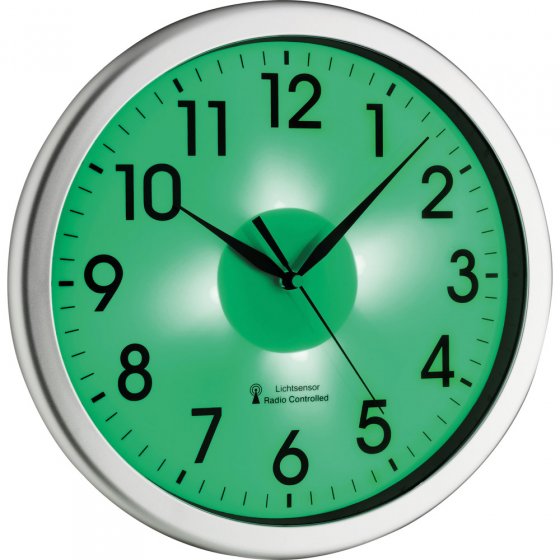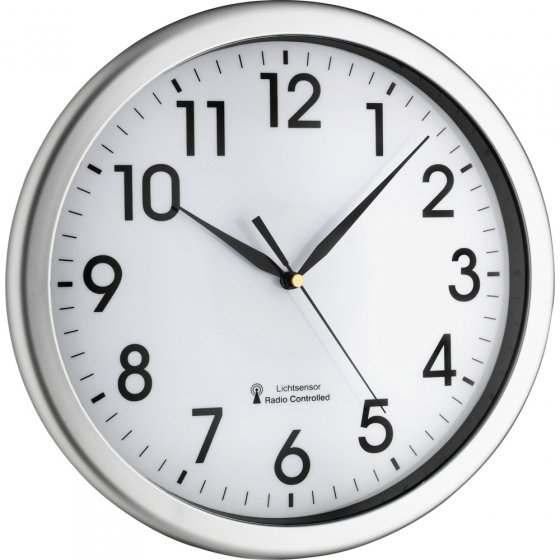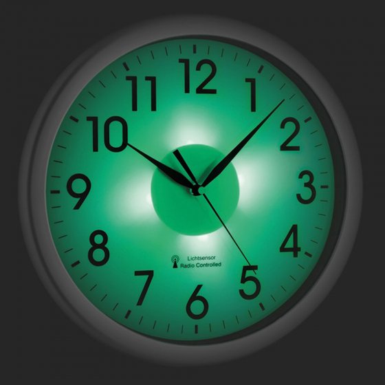 Ook in de nacht: een blik op deze klok verraadt in het donker hoe laat het is. Want de RADIOGRAFISCHE WANDKLOK MET LED-ACHTERGRONDVERLICHTING heeft een sensorgestuurde verlichting, die in het donker ingeschakeld wordt of blijvend aan of uit te schakelen is. Zo is, ook van een afstand, de wijzerplaat met zijn op de seconde nauwkeurige tijdsaanduiding in het donker afleesbaar – zonder dat u de lamp in de kamer hoeft aan te doen. Het uurwerk werkt geruisloos, op 4 AA-batterijen (afzonderlijk te bestellen). Overdag is de tijdloos eenvoudige kunststof behuizing in metaal-look (Ø 30 cm) een mooie wanddecoratie, in elke kamer!