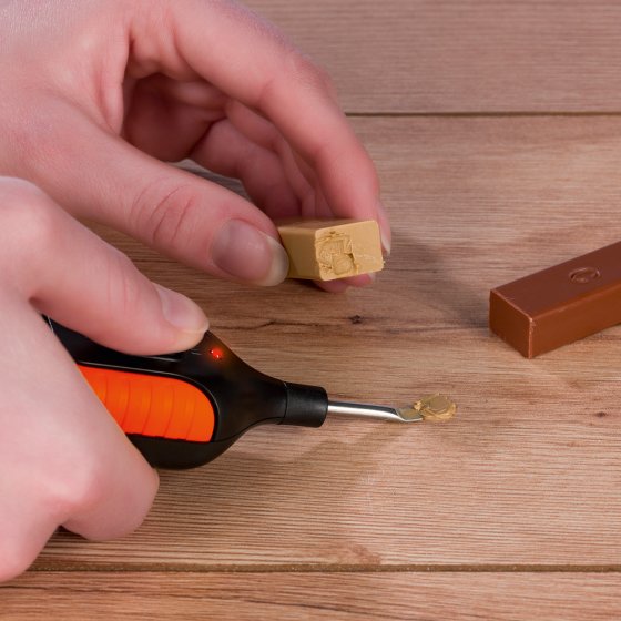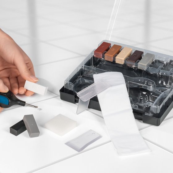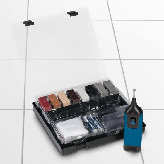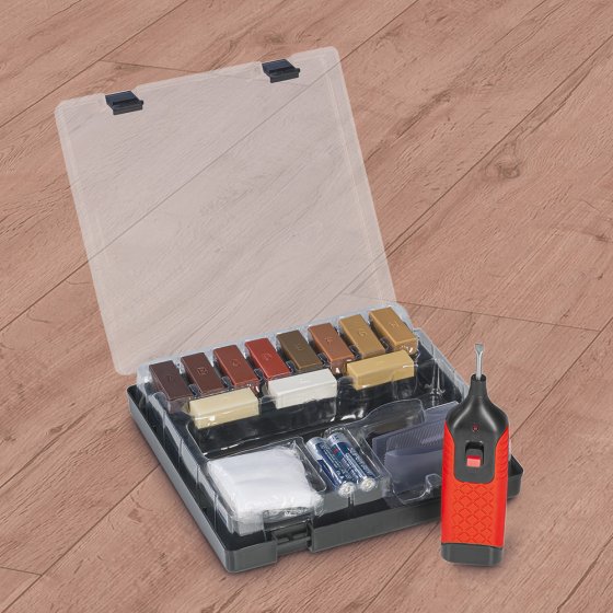 Scheurtjes in vloeren, deuren, kozijnen of op wandtegels zijn niet alleen lelijk, ze kunnen in huurwoningen ook voor ergernis zorgen. Met de REPARATIESET (voor laminaat & parket of voor tegels) kunt u scheurtjes en deukjes direct verdwijnen. Schakel daarvoor de op batterijen (batterijen inbegrepen) werkende hardwaxsmelter in, smelt het in kleur bijpassende blok hardwax en breng het nu gemakkelijk te bewerken materiaal met de metalen punt op de beschadiging aan. Laten afkoelen, klaar. De plek is gevuld en geseald. Materiaal verwijdert u met de spatel of met de schuurspons. Afmetingen (setkoffer, l x b x h): ca. 19 x 19 x 4 cm. Voor houten vloer of kurkvloer, tegels of natuursteen, raamkozijn of deurlijst: de reparatie lukt altijd en ziet er altijd goed uit.