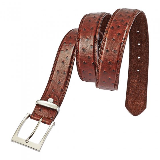 Met de LEREN RIEM IN STRUISLEER-LOOK, gemaakt van hoogwaardig rundleer, scoort u op modieus gebied. De karakteristieke struisleerstructuur – zwarte punten op middelbruin fond – is namelijk perfect te combineren met alle beige, bruine en zwarte kledingstukken. Afm. (l x b): ca. 130 x 4 cm, aanpasbaar. Een stijlvolle leren riem!