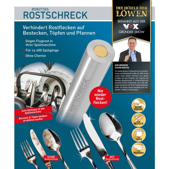 Vindt u het bij het uitruimen van de de vaatwasser ook zo vervelend om roestvlekken op messen, vorken en pannen aan te treffen? Oorzaak is voornamelijk de vaatwasser zelf: het ijzeroxide van schroeven of waterleidingen verzamelt zich op het bestek. De oplossing is de innovatieve ROSTSCHRECK – zijn aluminiumomhulsel is onedel als het edelstaal van het eetservies, met als gevolg dat deze roest eerder aantrekt. Alle keukengerei komt zonder vlekken uit de machine! Afm.: Ø ca. 2 cm, lengte ca. 10 cm. Is genoeg voor ca. 600 keer wassen in de vaatwasser. Tip: het huismiddel functioneert ook in de besteklade – want bij hoge luchtvochtigheid kan ook daar roest ontstaan.