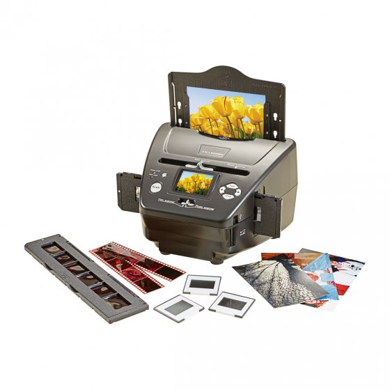 Elk medium voor beelddragers is aan veroudering onderhevig – daardoor verbleken papieren foto’s met de tijd en bij negatieven verslechterd de coating. Stel uw analoge beelddocumenten veilig voor verval door ze te digitaliseren! Met deze SCANNER ’3 in 1’ is dat bijzonder eenvoudig: leg uw foto’s, negatieven of dia’s in de daarvoor bedoelde sjablonen en start het scanproces – klaar is kees. U hebt geen pc of software nodig. Het scanresultaat wordt op het display (diagonaal ca. 6 cm) getoond en de beelddata worden op een geheugenkaart (afzonderlijk te bestellen) opgeslagen. Afmetingen (b x h x d): ca. 21 x 15 x 23 cm. Werkt op 230 V. Gun uw visuele herinneringen een tweede leven buiten de stoffige schoenendozen!